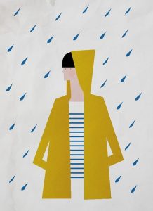 I put on my boots, grab my coat, the one that’s always waiting for me, my faithful yellow raincoat that accompanied me throughout my difficult teenage years and that Mother has kept for me on the hook in the hall above my boots. It reminds me of the row that exploded one evening when I was coming back from school and Mother saw the big black letters forming the word FREEDOM on the back of the yellow coat.